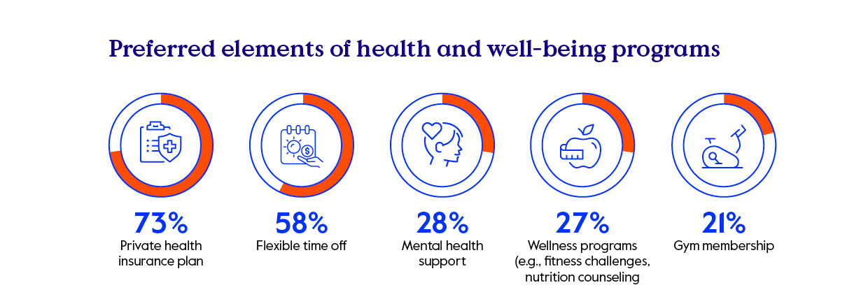 When asked about their preferences for health and wellbeing programs, a majority expressed a desire to have private health insurance plans (73%), followed by flexible time off or work arrangements at 58% and mental health support at 28%. Interestingly, subsidized gym memberships which may be the most traditional form of health support from employers, was only mentioned by about one in five Hong Kong respondents.