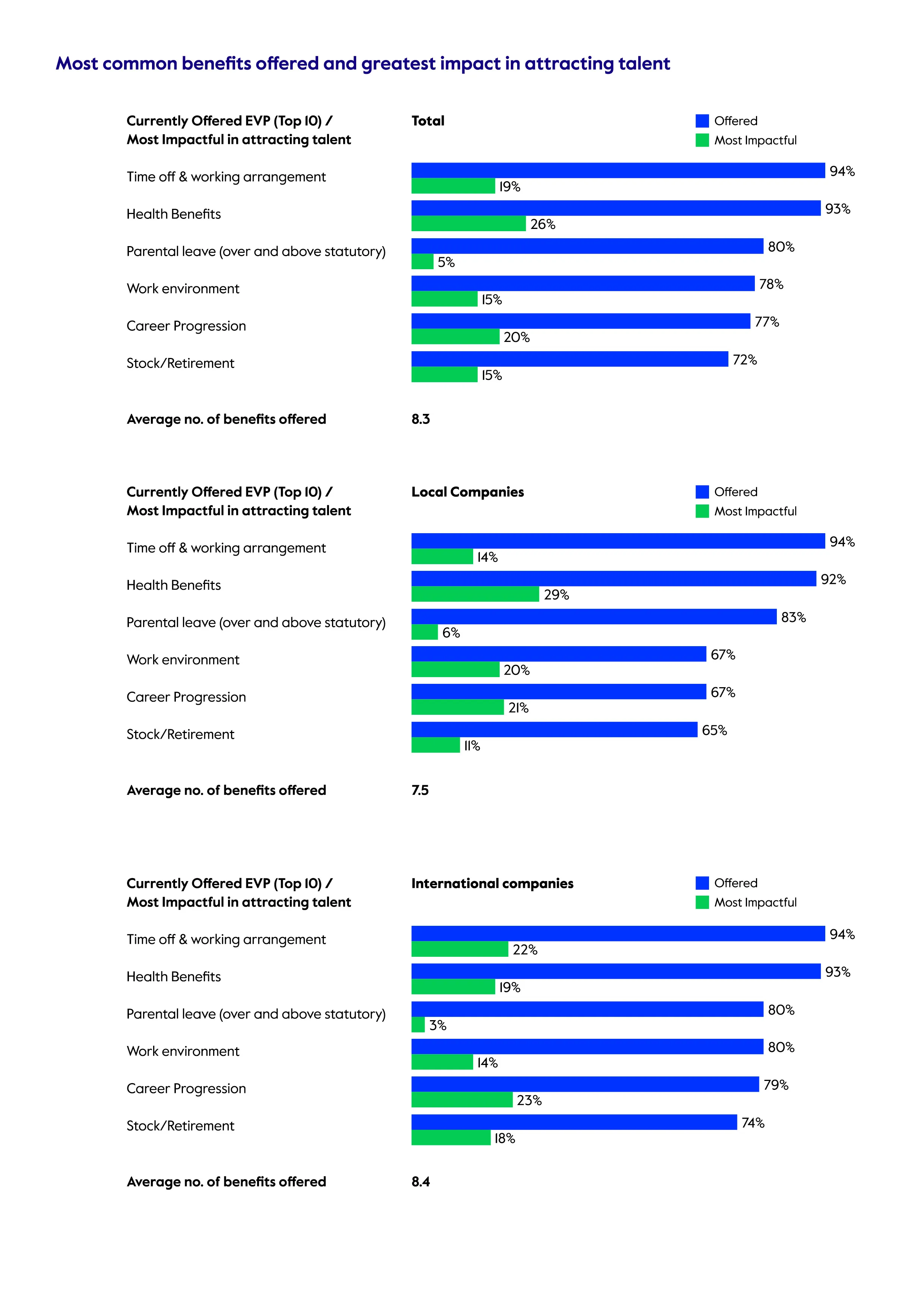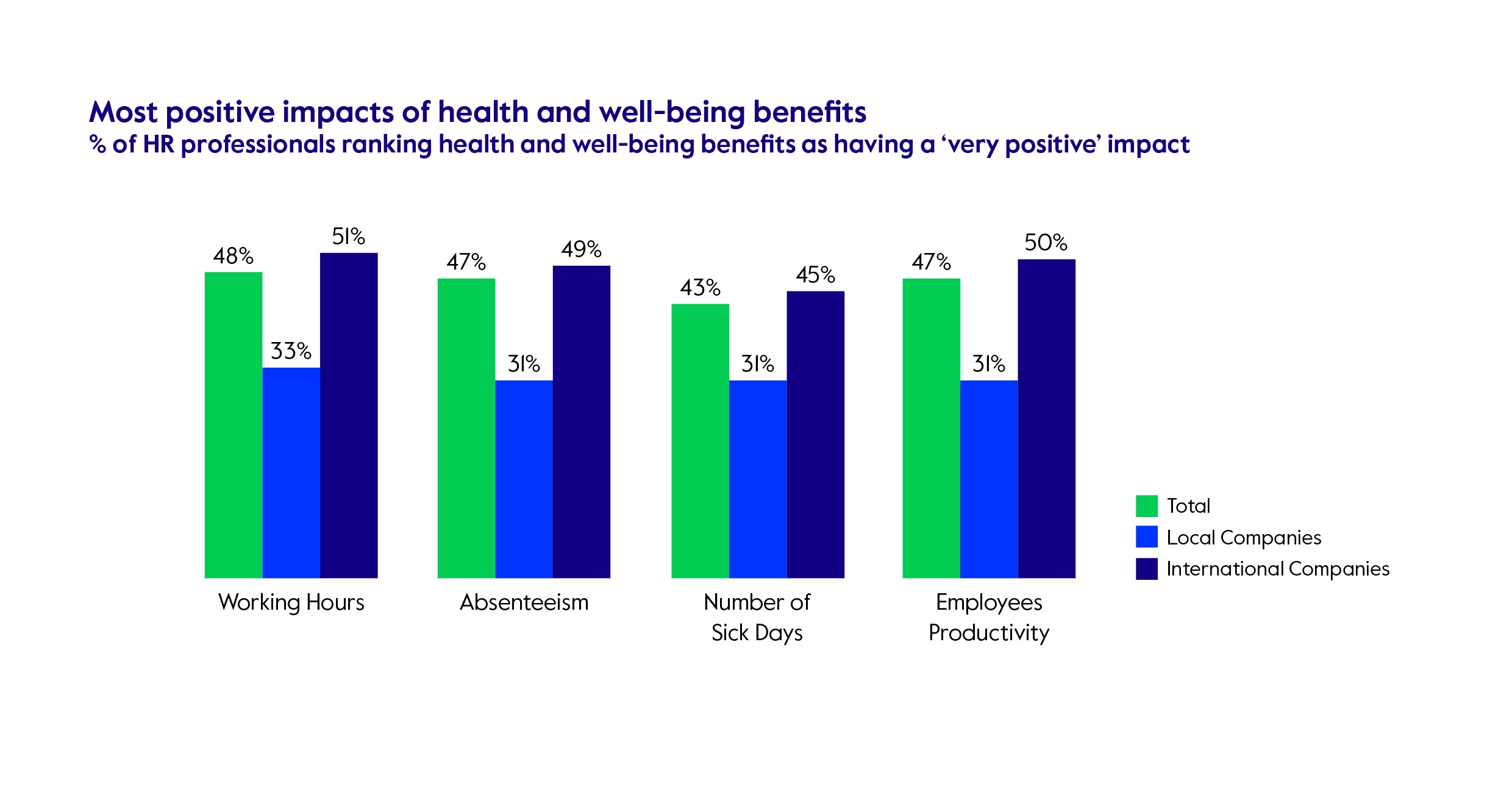 Health and well-being benefits are widely recognized as a major determining factor for talent attraction and retention. It is one of the most common EVPs, offered by 93% of employers, and HR professionals say it is the highest value benefit for attracting new talent. In fact, health benefits are considered more impactful than career progression or time off / flexible working arrangements, particularly among local companies.