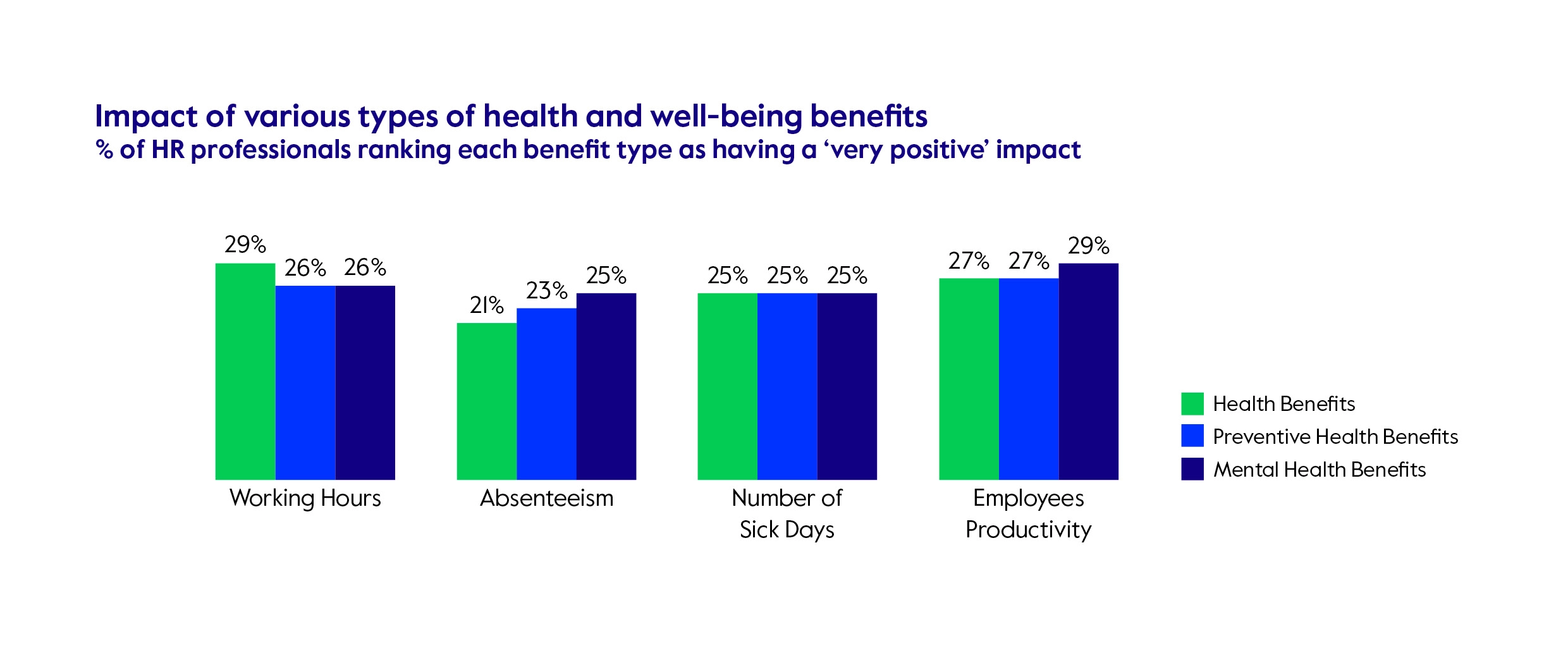 When we look more closely at the different types of health and well-being benefits offered, traditional health benefits have the biggest positive impact in terms of shortening working hours, while mental health and preventive health is most effective in improving employee productivity.