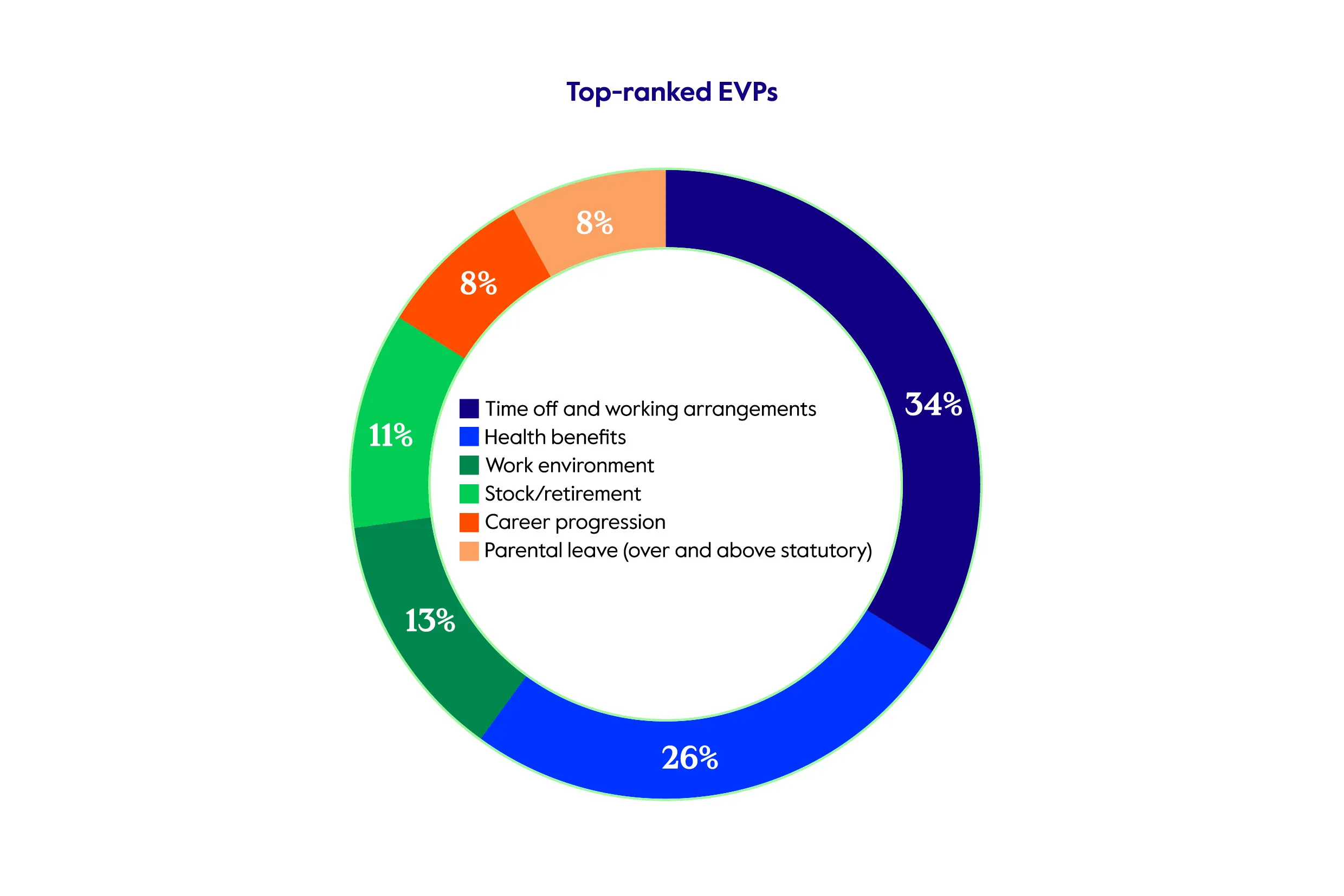 Across the five markets surveyed, 93% of HR leaders said they offer health benefits as an EVP. In terms of what HR professionals felt was most attractive from the employee point of view, flexible time off and working arrangements are regarded as high value (top choice for 34%), followed by health benefits (26%), and a positive working environment (13%). This demonstrates the importance of a long-term well-being culture running through the organization.