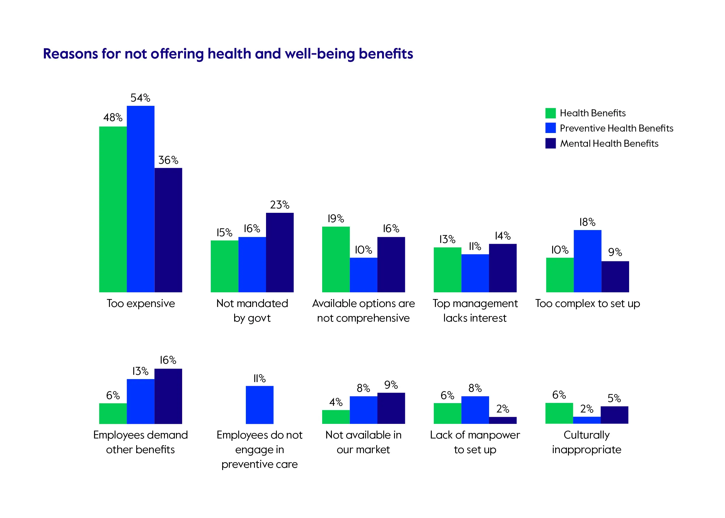The benefits of a comprehensive well-being strategy are clear, but a number of factors discourage or prevent companies from implementing one or upgrading their current plan. Price is naturally the main consideration, but others play a role – not least a lack of availability of comprehensive well-being plans in certain markets.