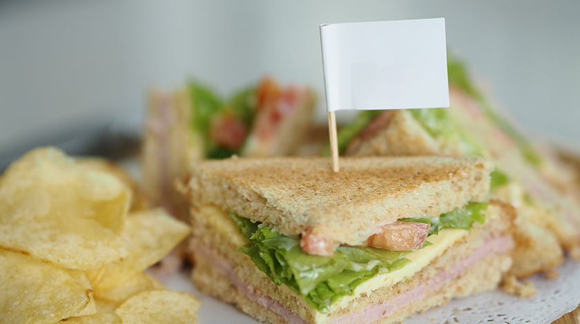 - Sandwich on a Stick (280 kcal) - Skewer bread cube, lettuce, halved cherry tomato, cheese cube, cucumber and another bread cube. Serve with pesto or mustard.
